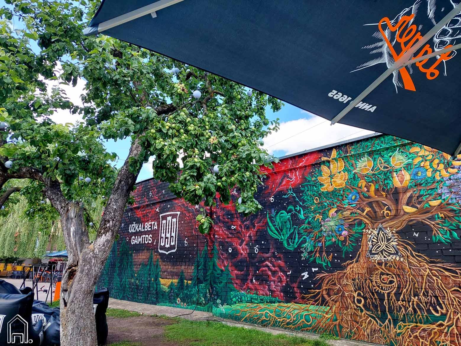 Greta išpieštos sienos, kaip tikrame sode, auga senos obelys, kurių šakas puošia spalvingos lemputės. Taip vienu pagrindinių piešinio akcentų tapo gyvybės medis - neatsiejamas mistiško, legendomis apipinto "Trejų devynerių" prekinio ženklo simbolis. Įvairių šalių mitologijoje gyvybės medis simbolizuoja pasaulio ir visatos struktūrą.