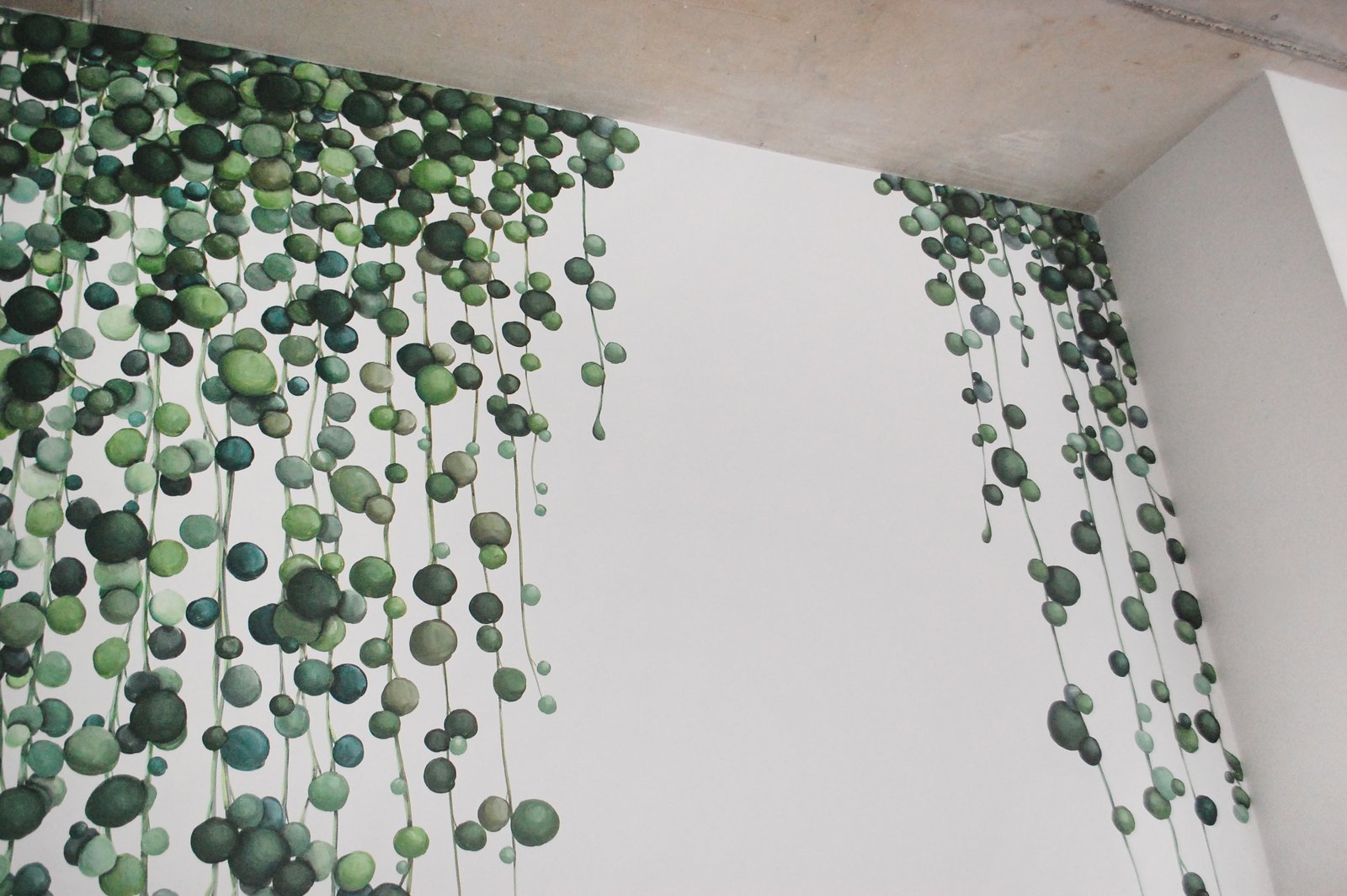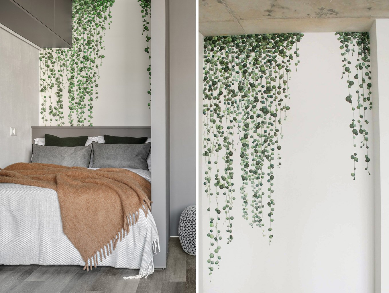 Ant sienos nutapytas vijoklis dėl savo apvalių lapelių vadinamas "perlų virvelėmis" arba "karoliukų virvelėmis". Skirtingų dydžių ir atspalvių lapeliai žaismingai užpildo, tačiau neperkrauna kompaktiškos miegamojo erdvės.