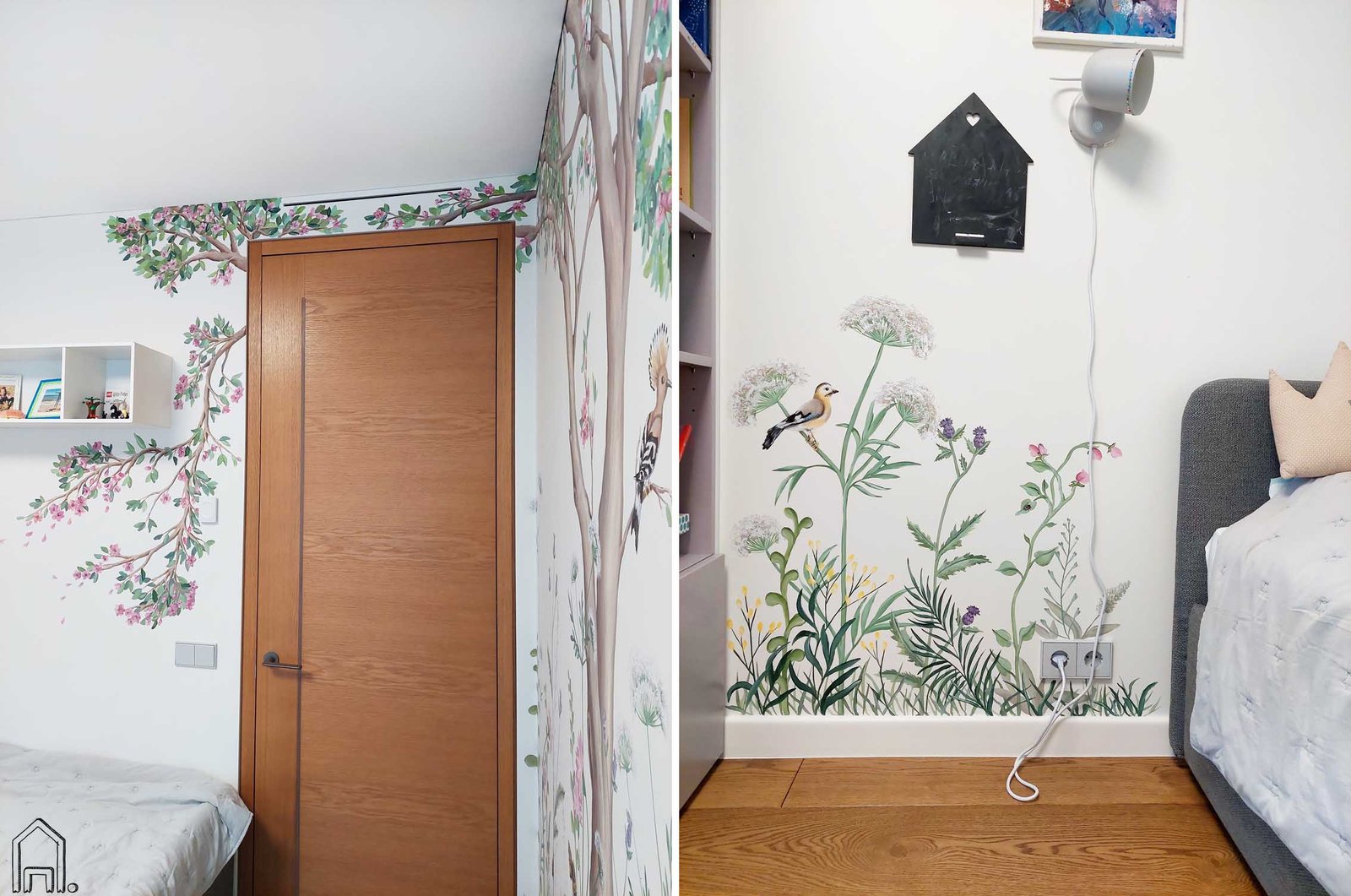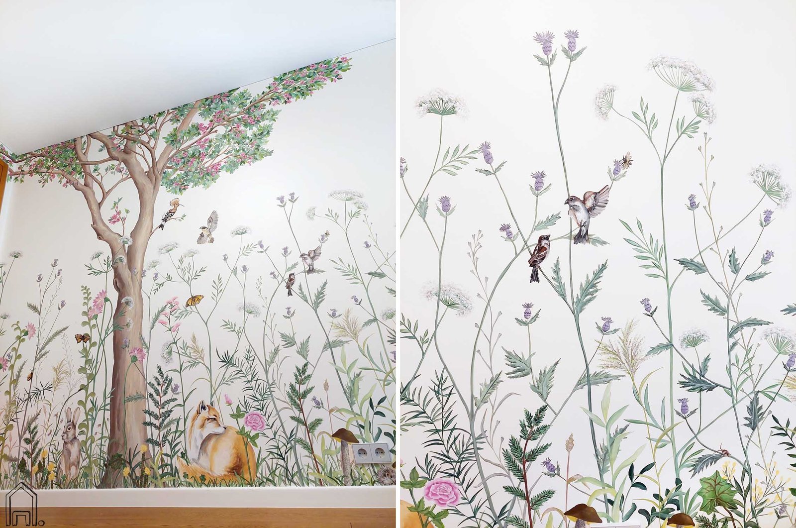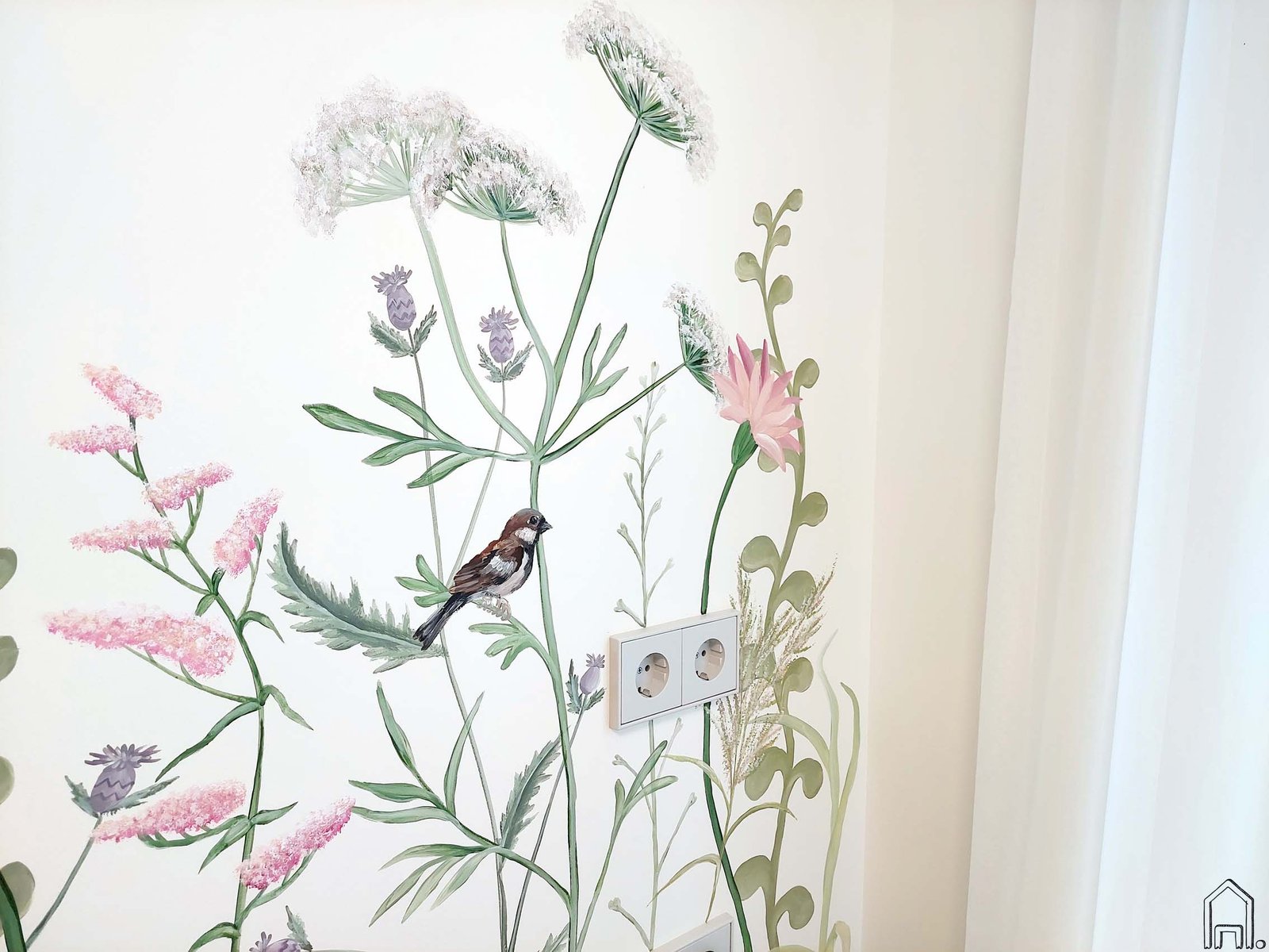 Švelniai, lyg nuo vasariško vėjelio, siūbuojančios pievos piešinys, nutapytas mergaitės kambaryje. Su mažąja piešinio užsakove aptarėme visas detales: kokie augalai turėtų augti jos kambario pievoje, kokie gyvūnai turėtų gyventi. Piešiant eskizą šiam piešiniui, su mergaitės mama nusprendėme, kad pieva galėtų augti po žydinčiu medžiu: taip piešinys pagyvintų didžiąją dalį laisvų kambario sienų. Kadangi piešinys buvo tapomas be jokio fono, buvo išlaikyta šviesa ir erdvės jausmas nedideliame kambaryje.