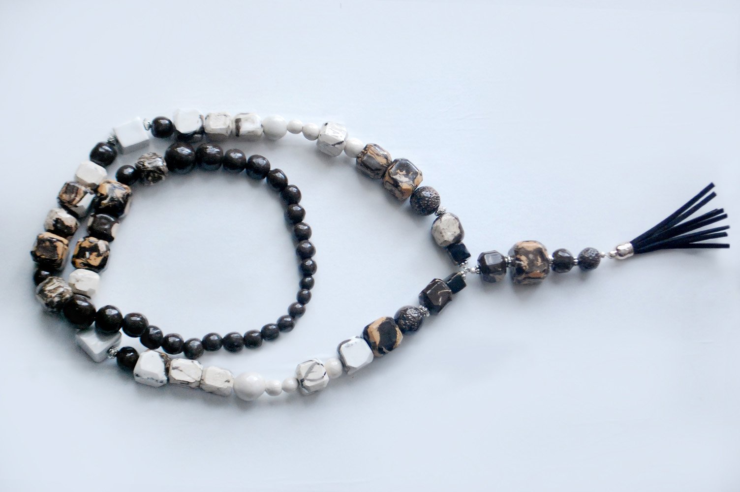 Rudai baltas , raštuotas, vėrinys su platinos gyslelėmis. Vėrinyje derinami net aštuonių skirtingų rūšių karoliai: šokoladiniai ir pieno spalvos apvalūs, briaunuoti marmuriniai pieno spalvos su rudomis gyslelėmis, briaunuoti marmuriniai šokolado spalvos su baltomis ir kreminėmis gyslelėmis, briaunuoti marmuriniai ochros spalvos su rudomis ir kreminėmis gyslelėmis, stambūs balti ir smulkūs juodi kvadratiniai, rudi, primenantys lavos uolienas. Kiekvienas karoliukas kruopščiai nulipdytas ir išskaptuotas rankomis, sukuriant vienetines faktūras ir papuošalui suteikiant išskirtinumo.