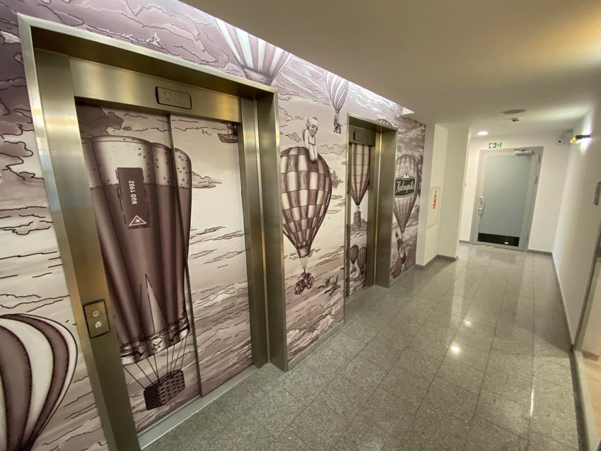 Kodėl gi liftų nepavertus meno kūriniu?! Iliustracija su padebesiais skrendančių balionų piešiniu perkelta į užsakovo darbo erdvę. Puikus pavizdys, kaip piešiniai gali pagyvinti ne tik mūsų namus bet ir erdvę, kurioje kasdien dirbame.