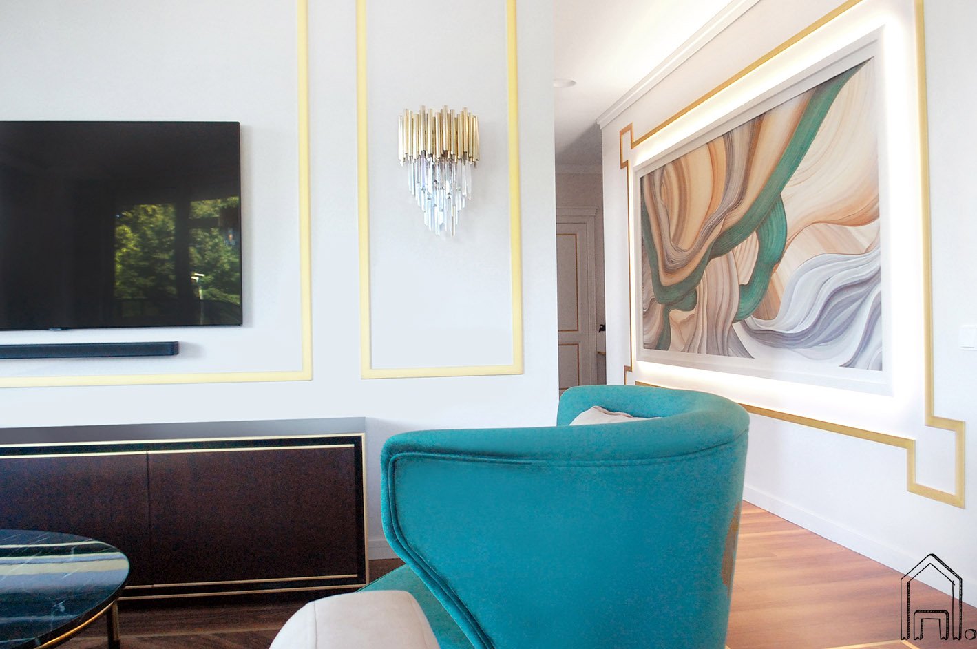 Išskirtinis, prabanga alsuojantis modernios klasikos interjeras sukurtas ne mažiau išskirtinėms asmenybėms. Unikalaus, sodrios smaragdinės spalvos elementais dekoruoto interjero koridoriaus erdvę papuošė abstraktus tapybos darbas.