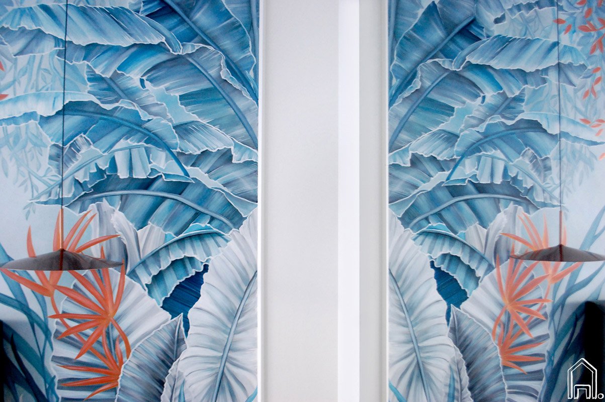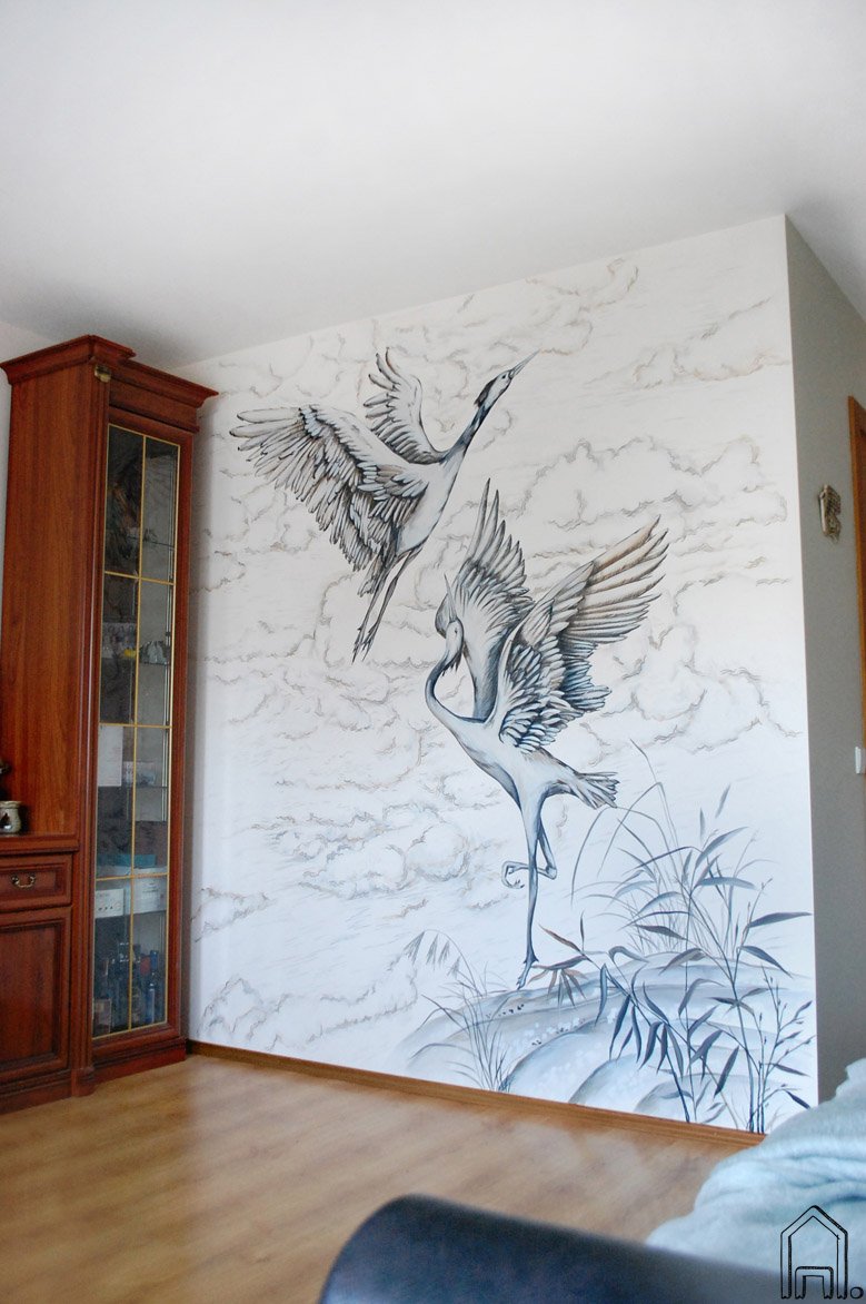 Grafiškas, padebesiuose šokančias japoniškas gerves vaizduojantis piešinys įgyvendintas klasikinio stiliaus interjere.