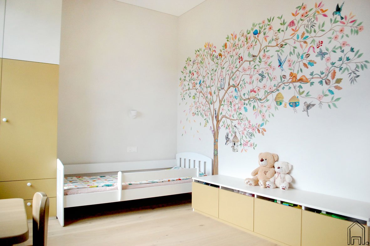 Spalvingas pasakų medžio piešinys nutapytas mažos mergaitės kambaryje. Kambario interjerui pasirinktos natūralios pastelinės spalvos, medžio faktūra, tad spalvingas medelis tapo nuotaikingu kambario akcentu.