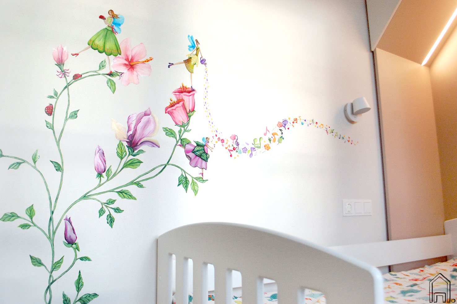 Mažos mergaitės kambaryje atsirado minimalistiškas piešinys su vijokliniu augalu ir fėjomis. Kadangi mažoji be galo mėgsta ne tik klausytis pasakų, bet ir šokti bei dainuoti, mergaitės mama iškart turėjo viziją, kad kambarį norėtų papuošti žydinčiu augalu ir pasakų fėjomis.