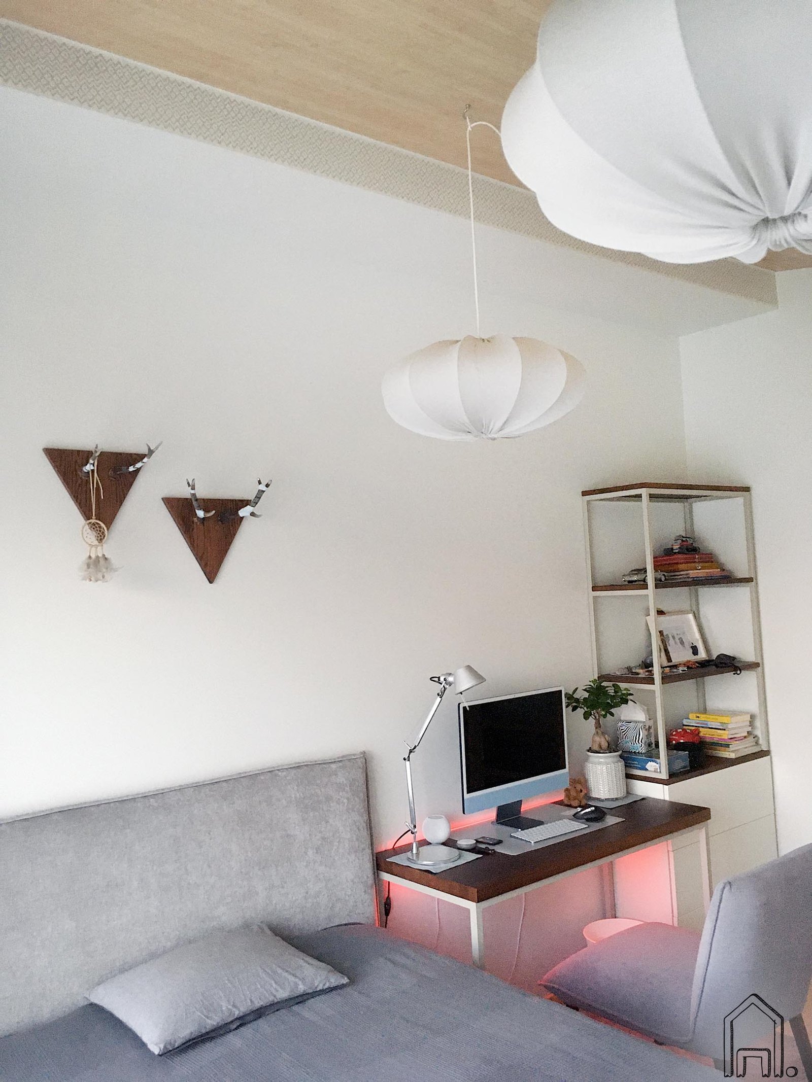 Kartais norint pagyvinti erdvę jos neperkraunant, bet suteikiant papildomo jaukumo užtenka vos kelių nedidelių detalių. Stilingame berniuko kambariui, kuriame dominuoja pilka ir smėlio spalvos ornamentu dekoruotas balkis palubėje, sieną virš lovos papuošė juostelėmis išmarginti stirnų rageliai.