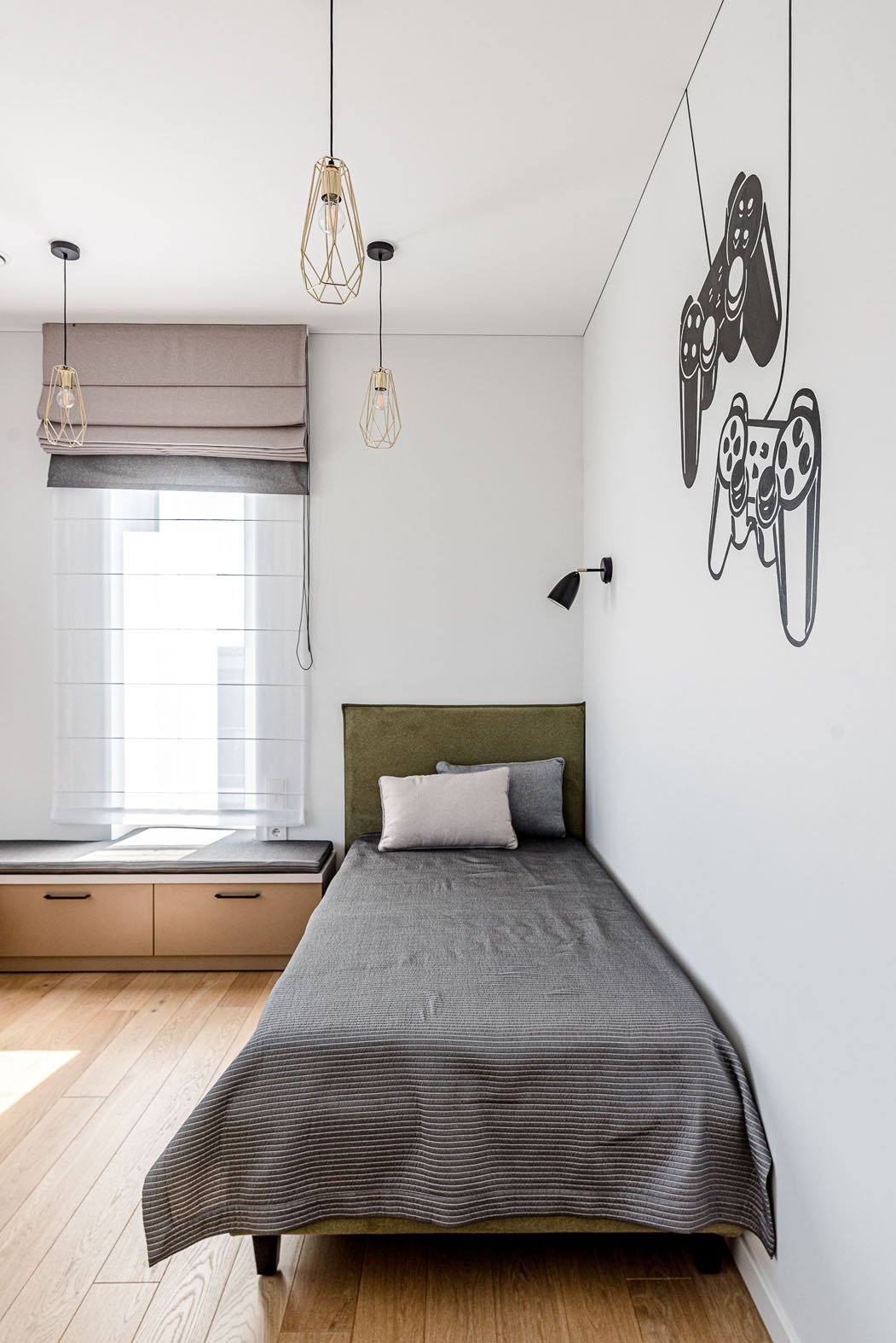 Stilingo, lakoniškų formų jaunuolio kambario interjerui parinktas vienspalvis grafiškas piešinys, vaizduojantis video žaidimų pultelius.