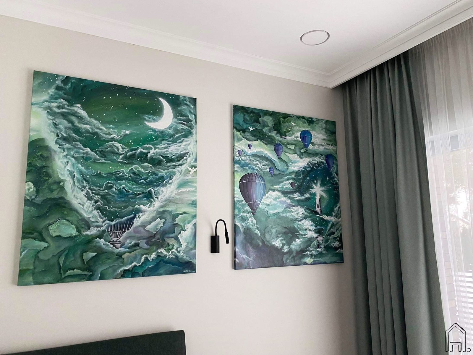 Sodrių tonų paveikslų diptikas nutapytas šiuolaikiškam jaunuolio kambario interjerui.