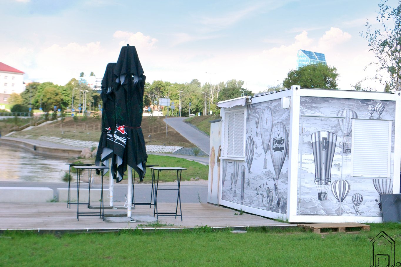 Pačioje Vilniaus širdyje, ant Neries upės kranto visą vasarą vilniečius ir miesto svečius prisėsti ir atsigaivinti gėrimais kviečia baras - lauko terasa "Upės krantas". Mobilus baras įrengtas jūriniame konteineryje, kurio fasadas dekoruotas piešiniu.