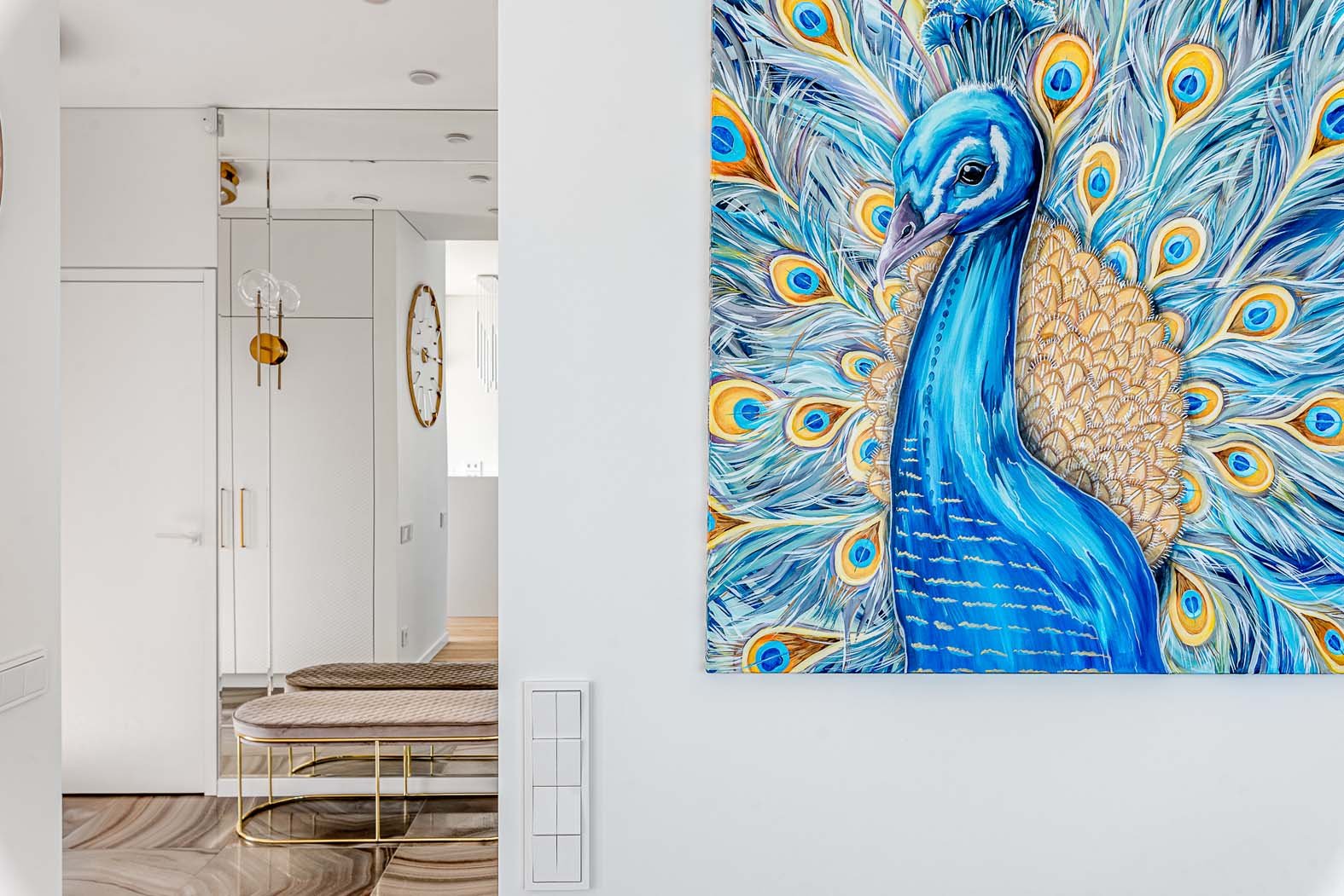 Daugelį savo plunsnų grožiu žavintis paukštis povas - įspūdingas laimės sergėtojas, didybės ir grožio simbolis, povo atvaizdas namams atneša laimę, klestėjimą ir sėkmę. Paveikslas su šiuo didingu paukščiu tapo šviesaus modernios klasikos interjero akcentu.
