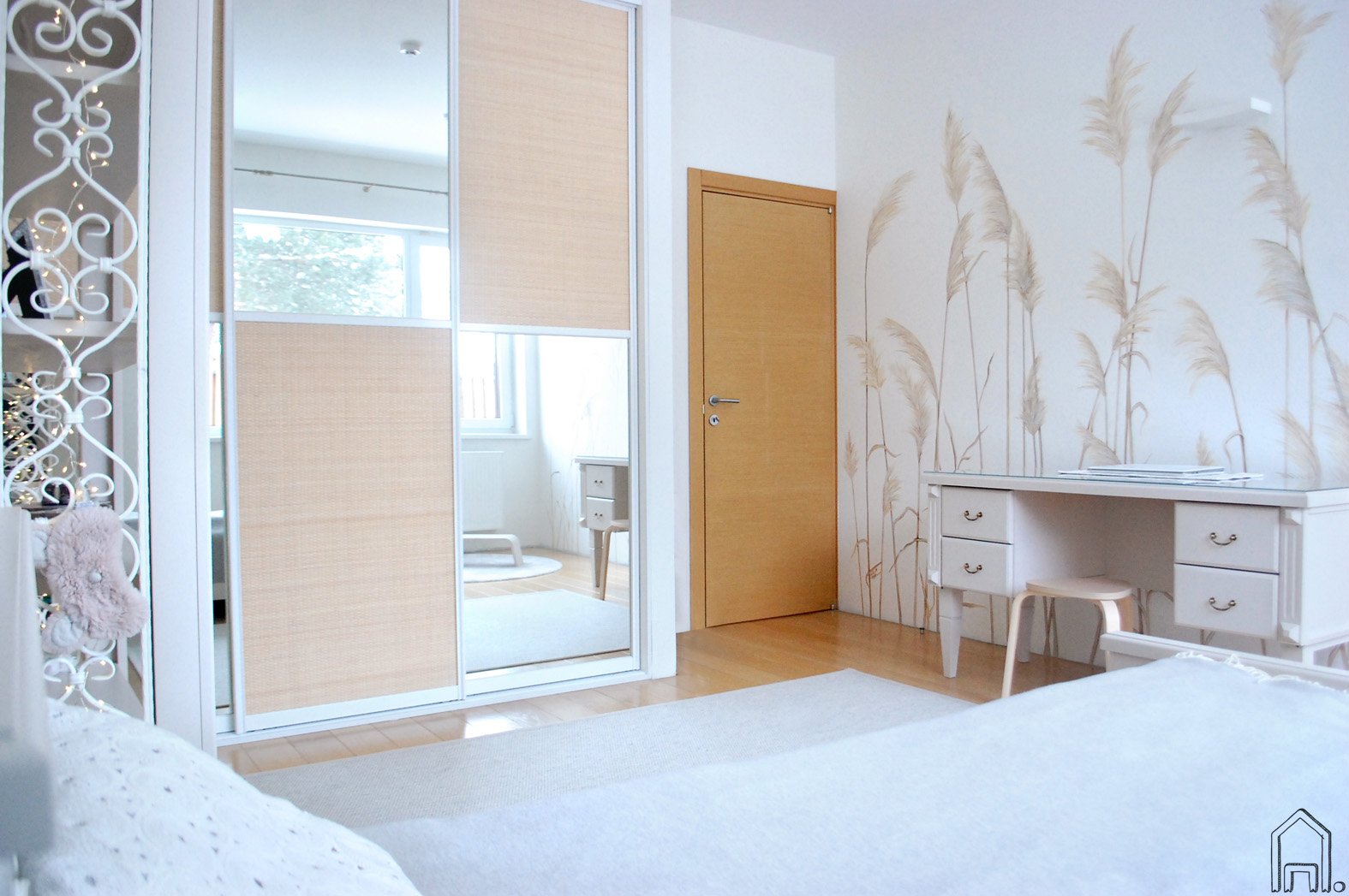 Ypatingai šviesaus ir saulėto merginos miegamojo siena pagyvinta nendryno piešiniu. Gamtos motyvai namų interjerui suteikiantys jaukumo, šilumos ir laisvės pabrėžia romantišką kambario nuotaiką.