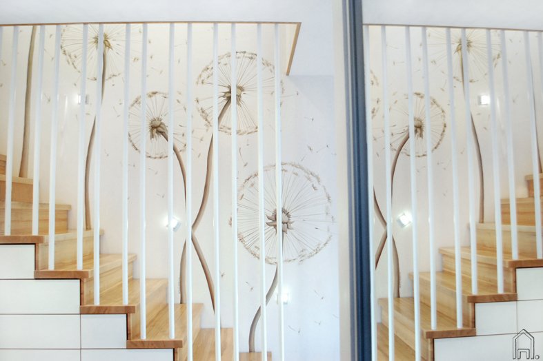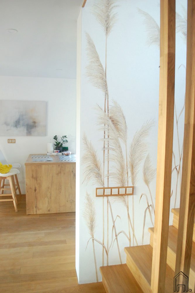 Nuo vėjo gūsių švelniai siūbuojančių nendrių piešinys laiptinės erdvėje suteikia moderniam interjerui šilumos ir jaukumo. Įgyvendinta klientų vizija gyventi arčiau besimainančios gamtos, kai namus supantys miškai, pievos, ežeras ir dangus matomi ne tik per langus, bet ir peržiangia slenksti į namų vidų.
