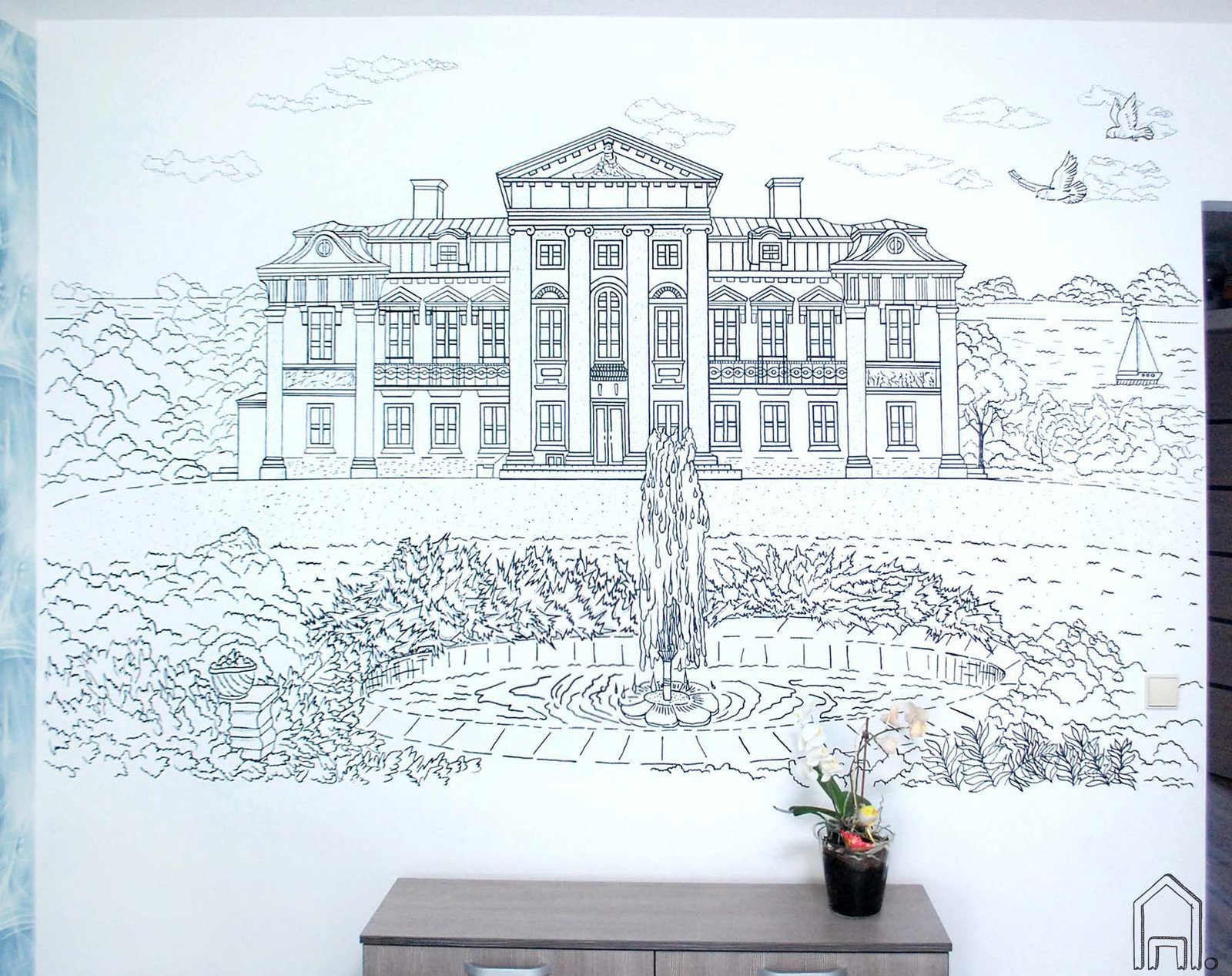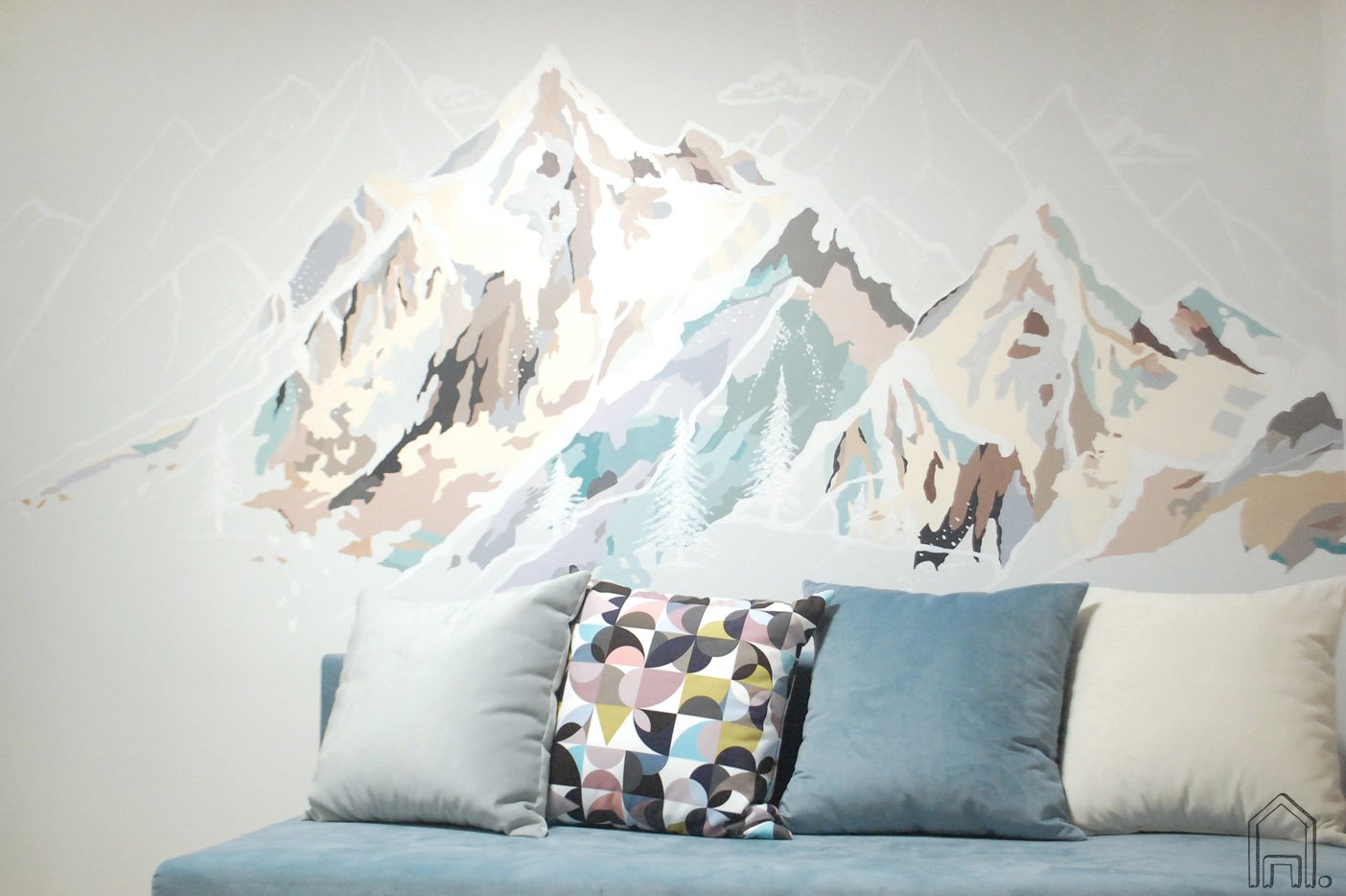 Kai nerandi norimo tapeto, interjerą visuomet gali pagyvinti piešinys! Svetainės interjere atsirado grafiškas užsakovų mylimo Paežerių dvaro vaizdas. Paežerių dvaras neretai vadinamas Suvalkijos perlu, užsakovai jo vaizdu norėjo džiaugtis kiekvieną dieną.