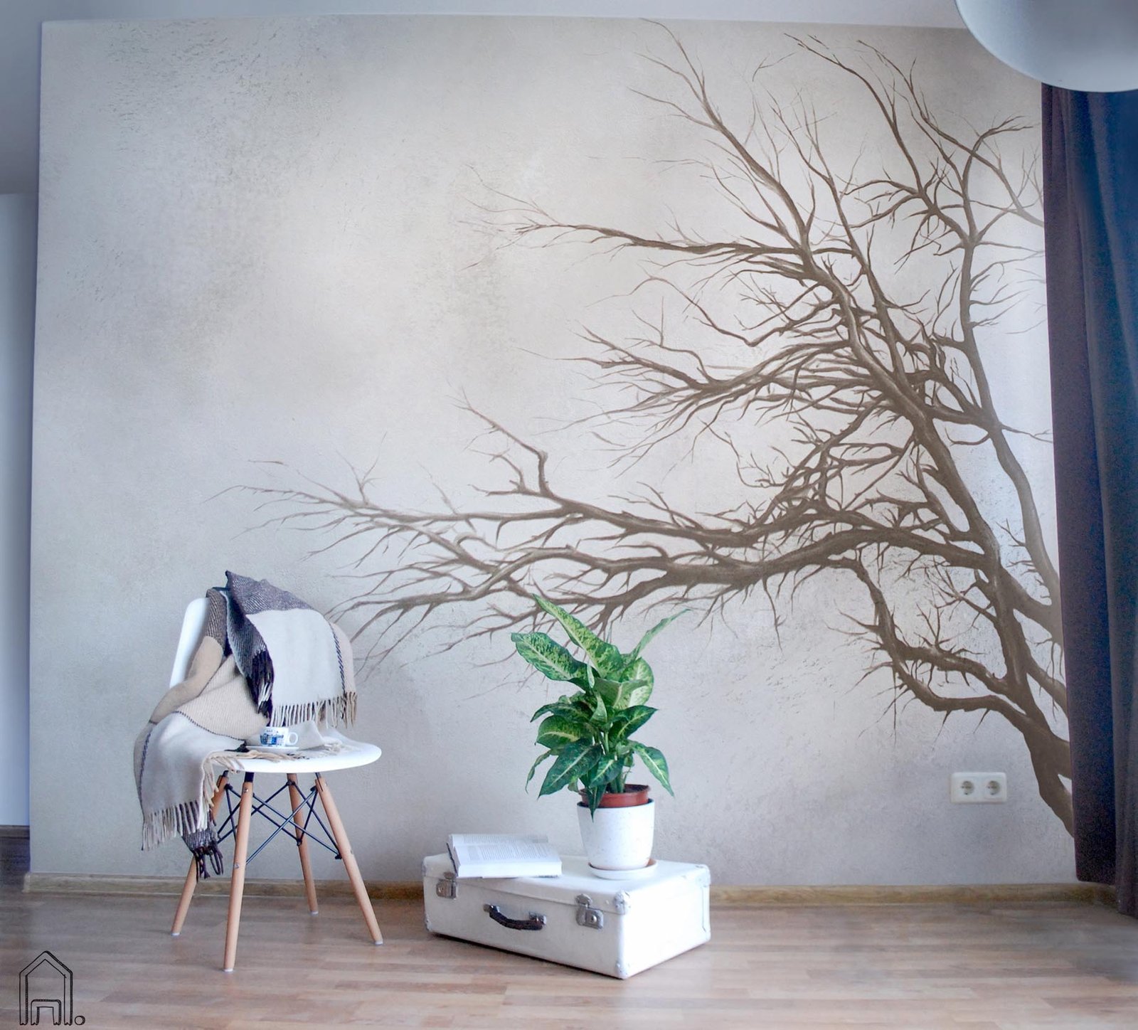 Moderniam, šiltų rudų atspalvių interjerui sukurtas medžio silueto piešinys. Šviesia gelsva spalva dažyta siena siena dekoruota potėpiais ir smulkia faktūra.