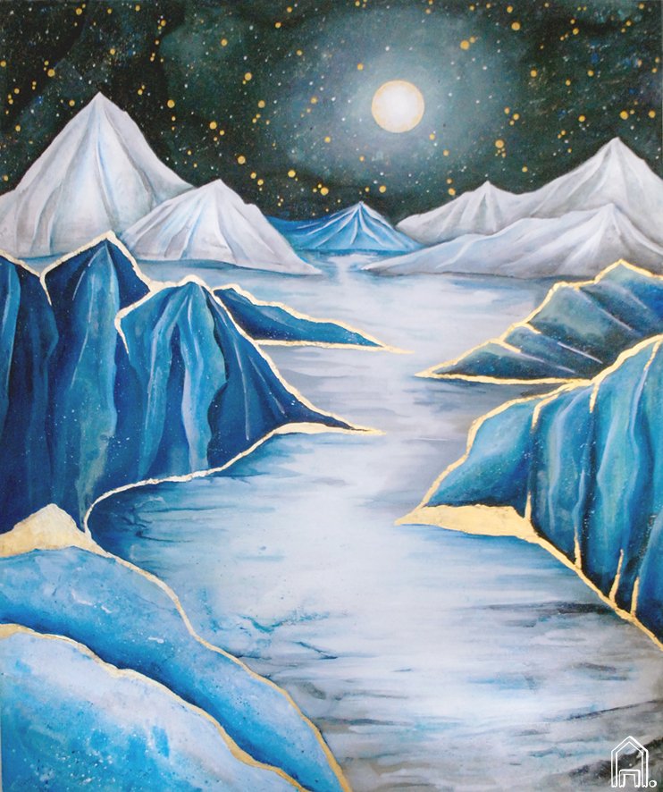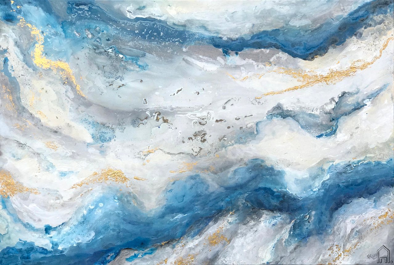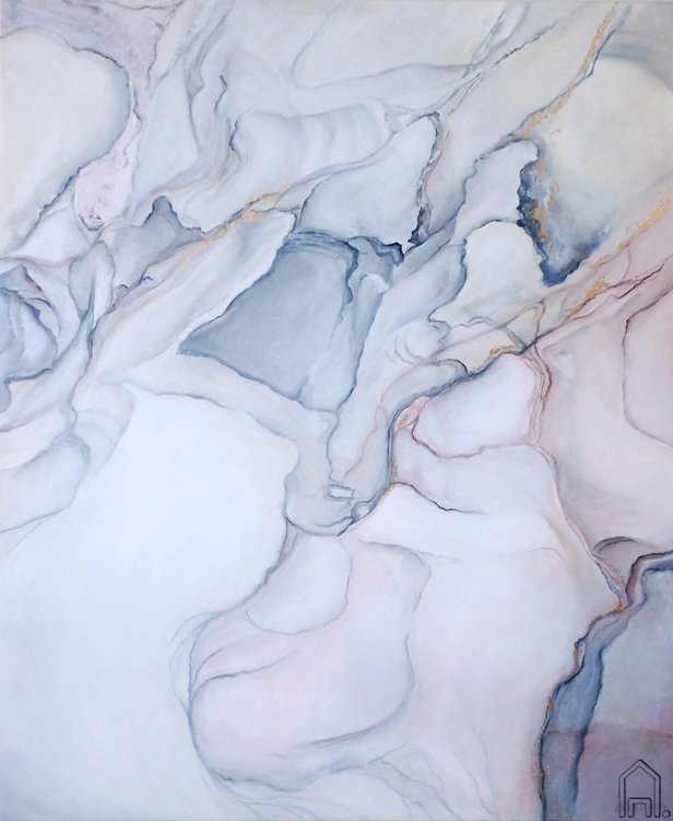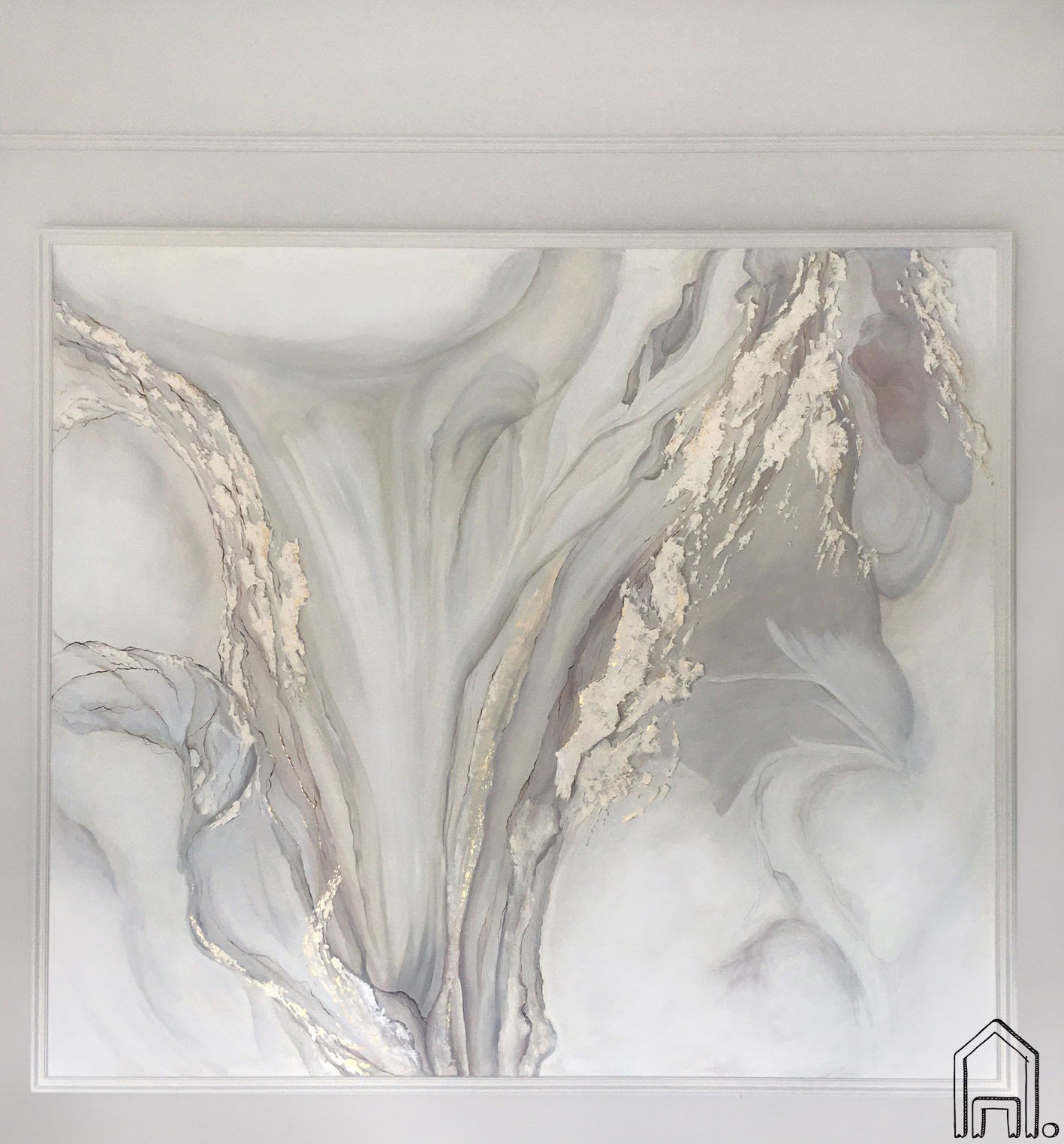 Ryškus ir kontrastingas paveikslas, sukurtas šviesiam jaunos šeimos interjerui. Nutapyta drobė su abstrakčiu užšalusių fjordų vaizdu - akcentas bendroje svetainės ir valgomojo erdvėje.
