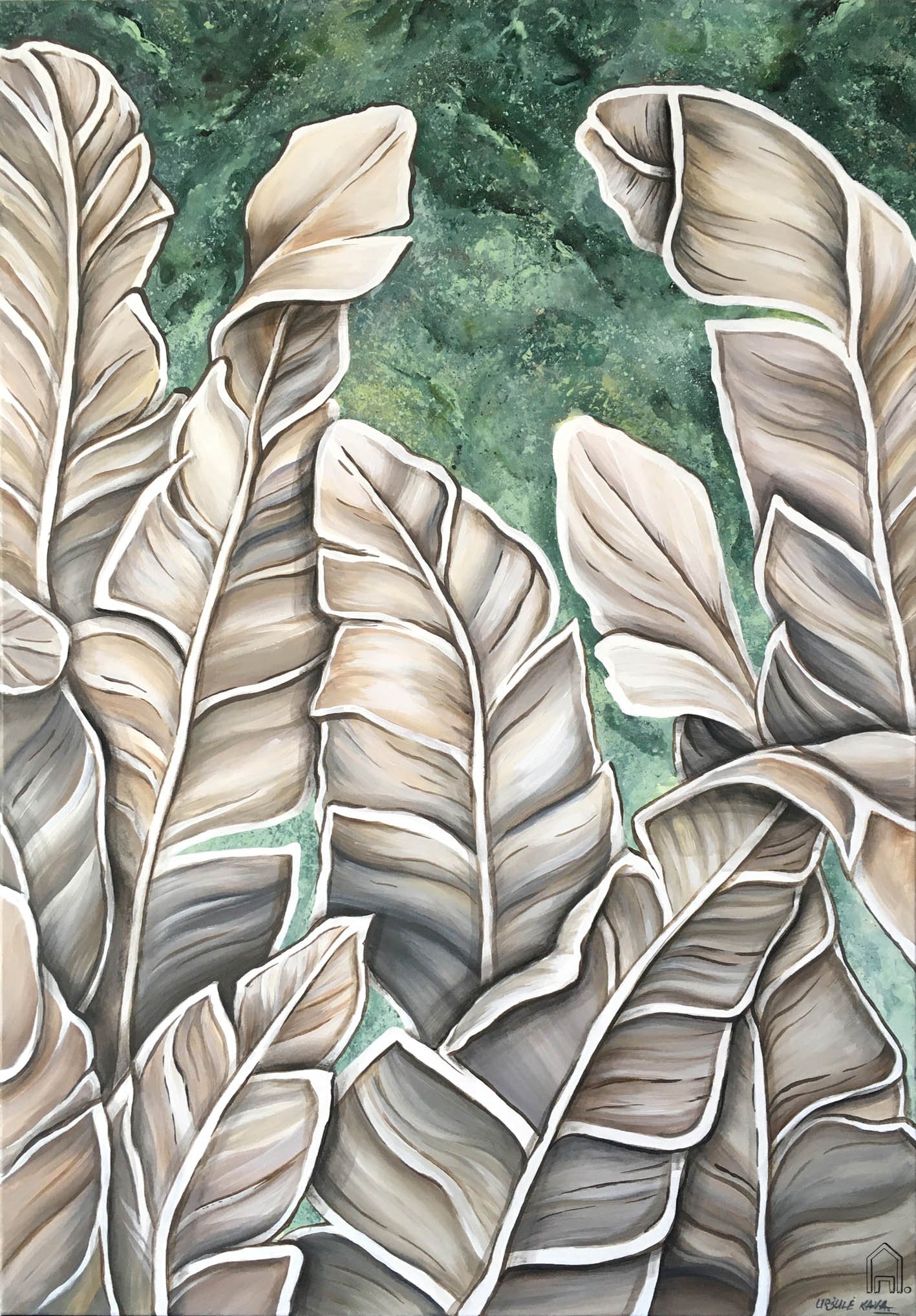 Gamtos motyvų, kaip dekoro, pritaikymas interjere gali būti pats įvairiausias. Šįkart stambūs ir išraiškingi tropinių augalų lapai teptuko pagalba nugulė ant drobės. Tapomai lapijai parinkta mažiau tradicinė šokoladinė spalva derantų prie tokių akcentų, kaip užuolaidos interjere. Ji susimaišo su įvairių rusvų atspalvių palete persidengiančia lapijoje.